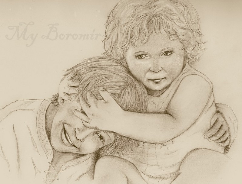 He wanted to look at his mother questioningly but couldn’t bring himself to break their eyelock, couldn’t bring himself to speak either. Faramir tilted his head and both hands that he had held close to his mouth reached up to grasp Boromir’s face. Boromir felt his tiny fingers, wet with warm baby spit, digging into his cheeks with unexpected strength and let himself be pulled down. The tip of his nose nudged Faramir’s little button of a nose.