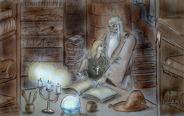 There is a moment in The Two Towers when Faramir tells Frodo and Sam about how he met Mithrandir when he was a child. This one was dwelling on my LJ for a while until I thought it could be worth some attention. ;) “He got leave of Denethor, how I do not know, to look at the secrets of our treasury, and I learned a little of him, when he would teach (and that was seldom).” There is a moment in The Two Towers when Faramir tells Frodo and Sam about how he met Mithrandir when he was a child. When I figure young Faramir I see an intelligent and sensitive child, lonely but enchanting in his own way. Strolling solely through the dark hallways of his father´s stronghold he must have met the wizard when Gandalf was searching old scrolls of parchment and century-old books close to fall apart. Of course at first he would be all grumpy old man, like “This is no place for children. is there no one to play with you?” When the boy answers “No. my Lord” (or whatever´s the polite way to address a wizard) it takes him a moment to realize that it is the plain truth. So he takes the kid in and teaches him what he knows about ancient languages and long lost kingdoms. Not long and he enjoys the company of the mindful child as much as Faramir enjoys his lessons. Later the young captain of Gondor will bethink of the candlelit hours he spent with the old wizard as some of the most precious remembrances of his childhood… *Sniff* All those tiny stories within a great one… Could anybody please make a movie of this? However, I tried my very best for myself. Oh, and yes, I know you could mistake kiddie Faramir for Pippin. I wish there was more than only one haircut in all Middle Earth… >.< See LiveJournal for a larger version. Posted May 21, 2011 |