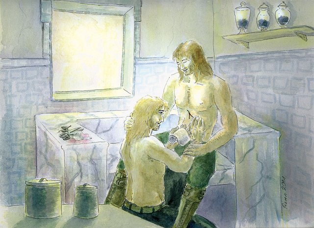 Thanks to December for inspiration! Technique: Water Colours, ink pencil After having a long and thoughtful chat about sanitary issues in Minas Tirith (how the heck do they get all the water and fire wood up the mountain?) I felt the urge to do something that contains marble interior or a sort of Roman bathhouse atmosphere. Totally not my fault that in such an environmentpeople tend to be only half-dressed. X) The background story: Well, I just assumed that Boromir would be a hell of a sparring partner in fighting lessons. From time to time he gets carried away by his own magnificence and then somebody who was actually not supposed to get hurt bears a “friendly” scratch. Of course afterwards Boromir is terribly sorry and turns into an awkwards little teddy bear – whereas his brother finds himself being the one who has to offer some comfort. High-resolution version available at LiveJournal Posted Dec 11, 2011 |