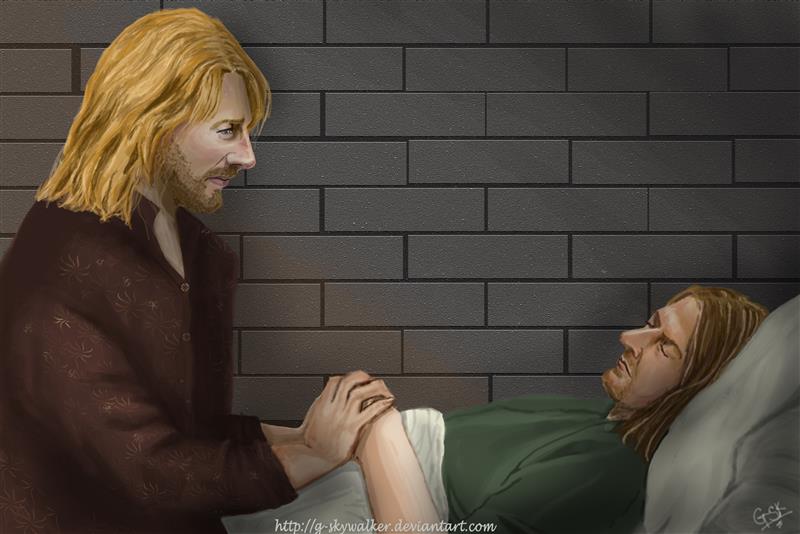 This is another drawing of my Boromir/Faramir fic. Boromir is enjured in battle on the fields of Ithilien by the leader of a company of Uruks. Boromir in an attempt to protect his youngest brother, falls wounded by a poisoned arrow. For the full-sized version, see deviantArt. Posted Jul 27, 2013 |