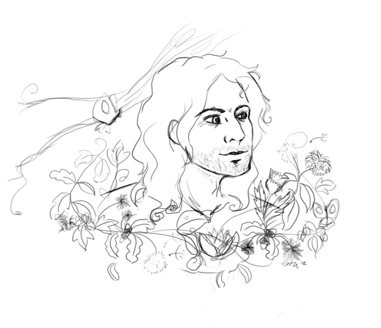 Aaaw, that´s pretty! I didn´t even know you draw as well! And I LOVE all the different sorts of flowers (and the butterfly) and the way they surround him like… like a summer storm!